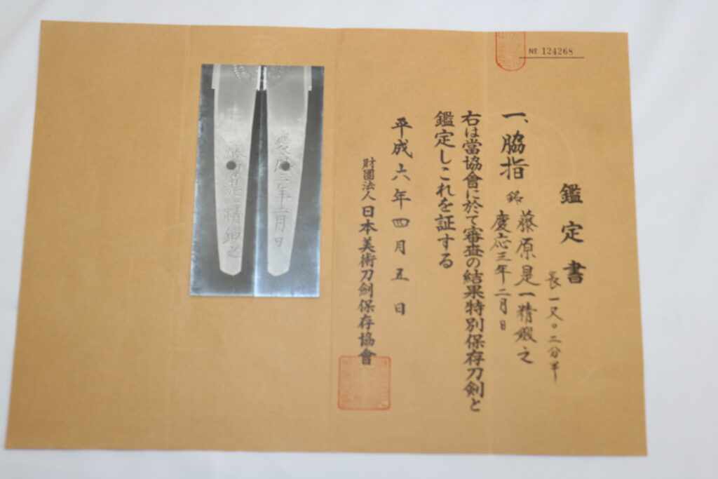 藤原是一精鍛之 銘藤原是一時代江戸後期(慶應)長さ31.2cm附属特別保存鑑定書価格680,000円 政太朗、助三郎。文政三年一月長運斎綱俊次男として生まれ 七代目を継ぎ是一となる。位列は新々刀上々作である。この作は直刃で無傷無欠点。